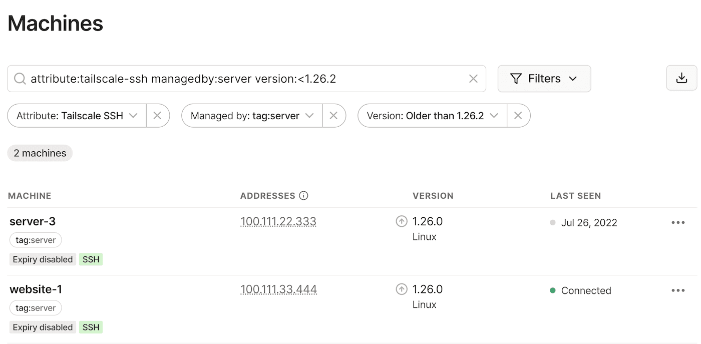 - Currently connected: Matches devices that are currently connected to your tailnet.